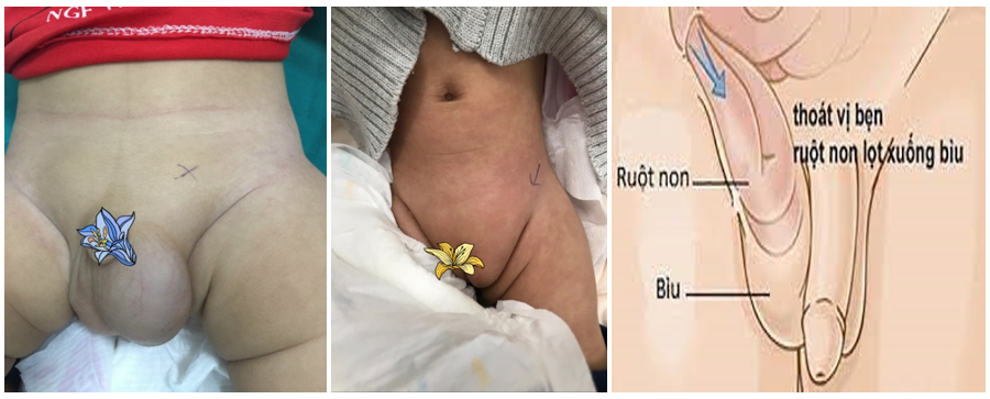 một khối phồng vùng bẹn bìu ở bé trai và vùng gần âm môi ở bé gái. Khối phồng