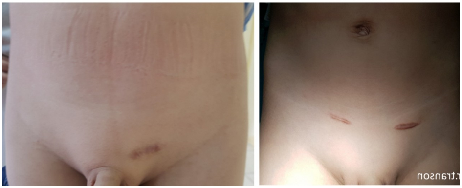 2. Hình sẹo sau mổ mở 2 bên (ảnh bên phải), và 1 bên (ảnh bên trái)