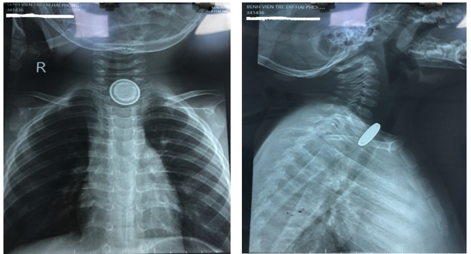 Hình ảnh dị vật pin cúc trên phim chụp X quang cổ