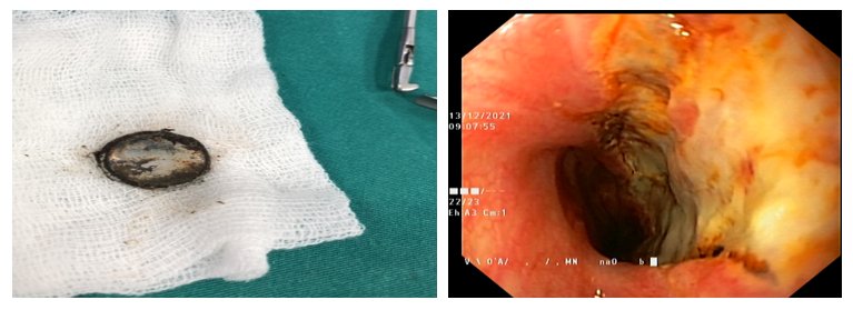 ra được dị vật là viên pin cúc áo đường kính 2cm, phủ dịch rỉ nâu đen, tại thực quản vị trí dị vật nằm đã có hiện tượng