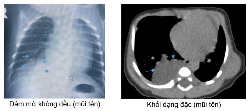 ảnh chụp Xquang phổi và CLVT có tiêm thuốc cản quang của bệnh nhi khi vào viện: