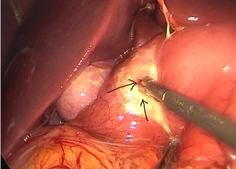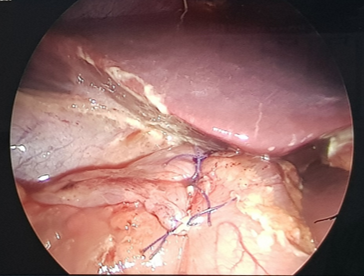 Trong quá trình phẫu thuật nội soi quan sát thấy ổ bụng chứa nhiều dịch mủ bẩn, dịch tiêu hóa, phát hiện 1 lỗ thủng mặt trước môn vị dạ dày, bằng kinh nghiệm và tay nghề của bác sĩ phẫu thuật, bệnh nhân đã được khâu đóng lỗ thủng, làm sạch ổ bụng.