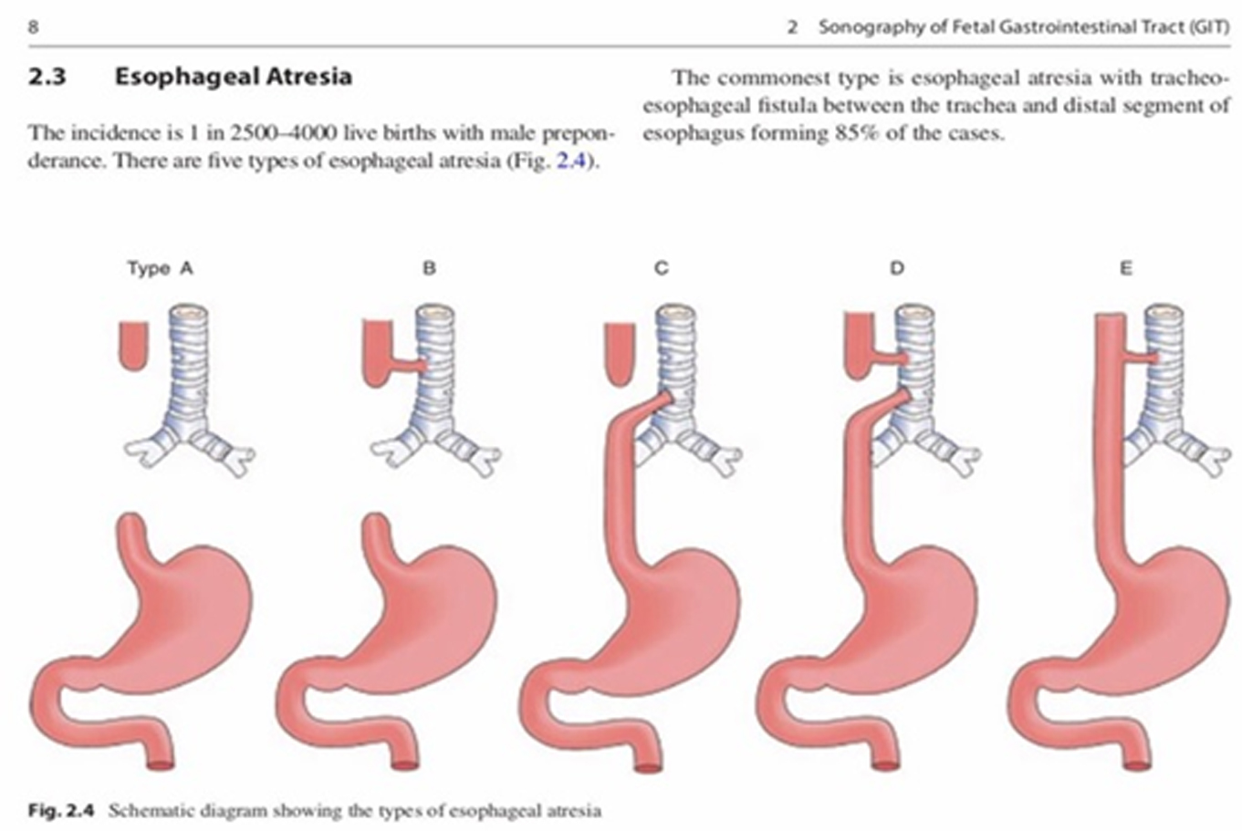 Trong teo thực quản type A, 2 túi bịt thực quản ở 2 đầu nằm cách xa nhau,thường khoảng cách giữa 2 túi bịt này dài trên 4 đốt sống, làm cho việc thực hiện miệng nối một thì rất khó khăn.