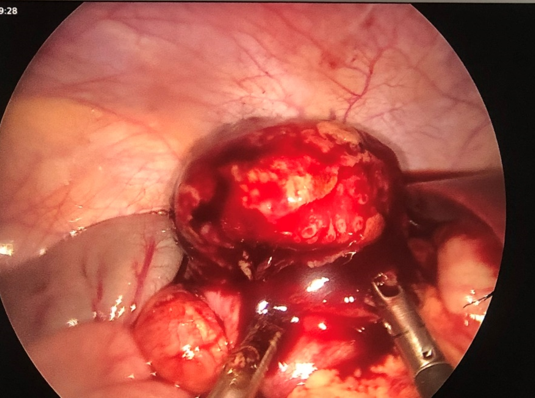 u, các bác sĩ đã tiến hành cắt u bằng dụng cụ nội soi, khối u không có cuống,