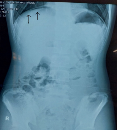 Xquang của bệnh nhân có liềm hơi dưới cơ hoành, dấu hiệu của thủng tạng rỗng