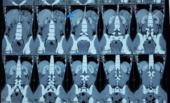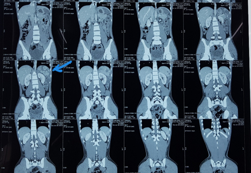 sau điều trị 14 ngày, mũi tên chỉ vị trí vỡ lách, các mảnh vỡ đang liền, khối