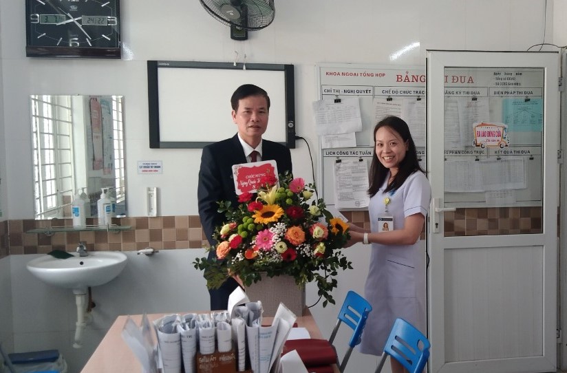 lãnh đạo Bệnh viện tới các khoa, phòng để tặng hoa cho viên chức, người lao động