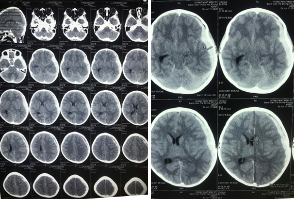 Sau khi chụp phim CT Scan sọ não phát hiện khối máu tụ dưới màng cứng vùng trán, thái dương, đỉnh trái có đè đẩy đường giữa qua phải 8,4mm, gây xẹp não thất bên trái.