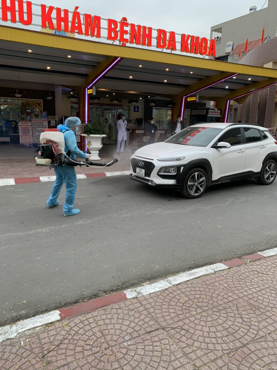 Cán bộ Trung tâm Y tế quận Kiến An thực hiện công tác khử trùng toàn bộ bệnh viện
