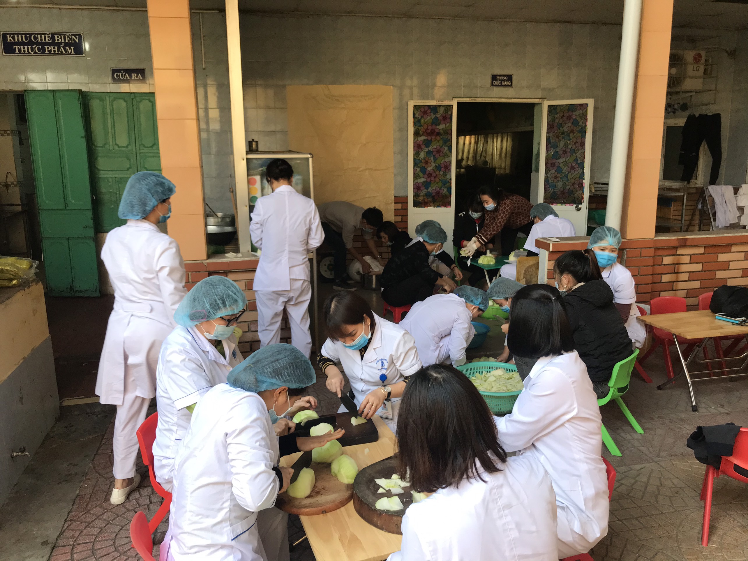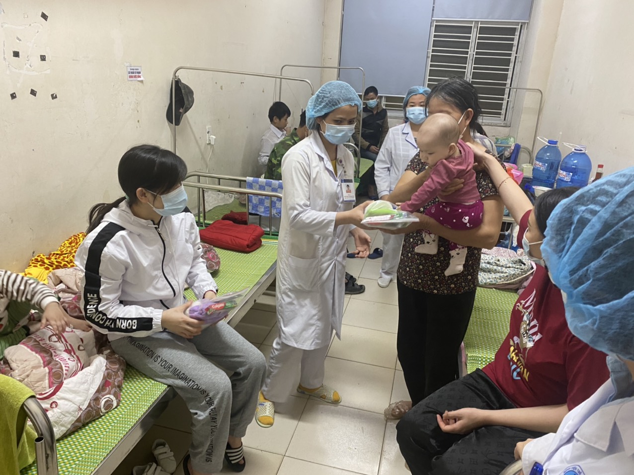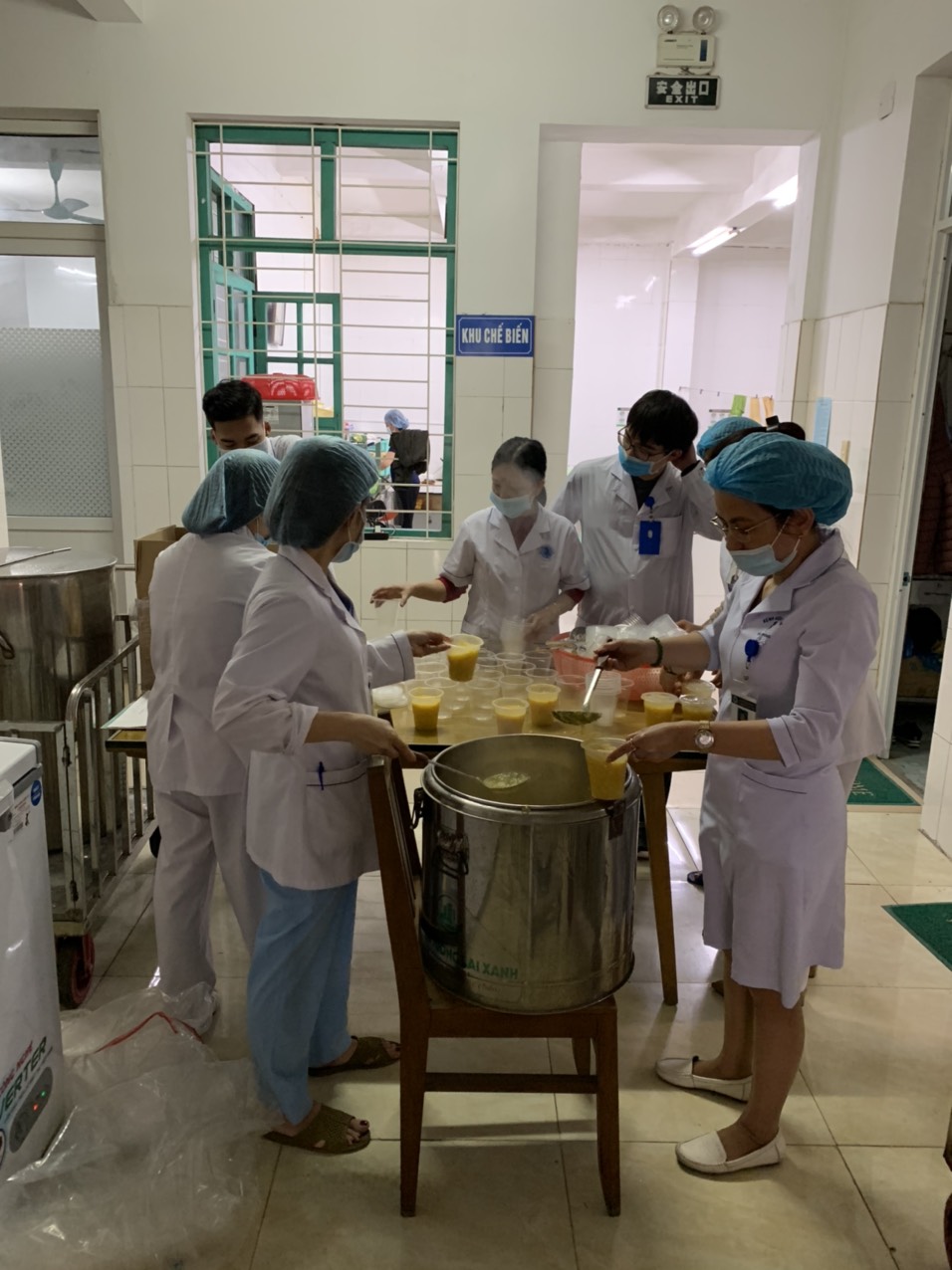 Trong ảnh các NVYT chuẩn bị bữa ăn và cấp phát các vật dụng thiết yếu cho gia đình người bệnh
