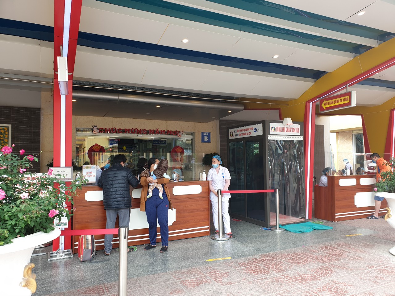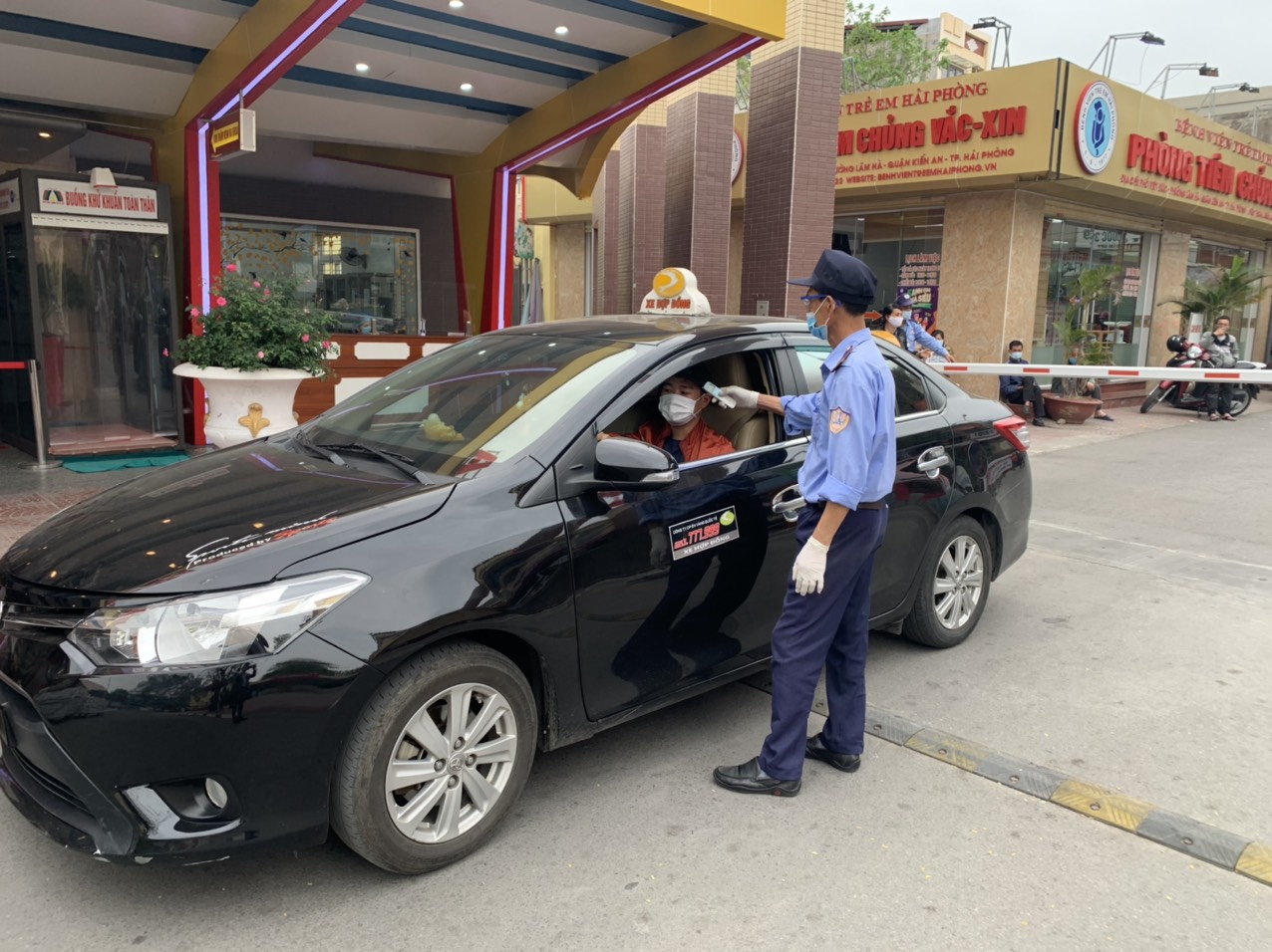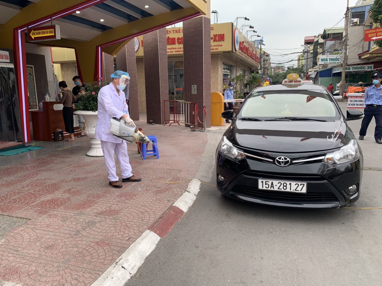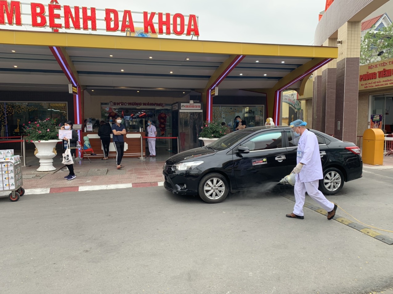 - Ngay tại cửa ra vào của bệnh viện đành cho người đi bộ, bệnh viện bố trí nhân viên y tế thường xuyên 24/24 kiểm soát, đo thân nhiệt của người qua lại.