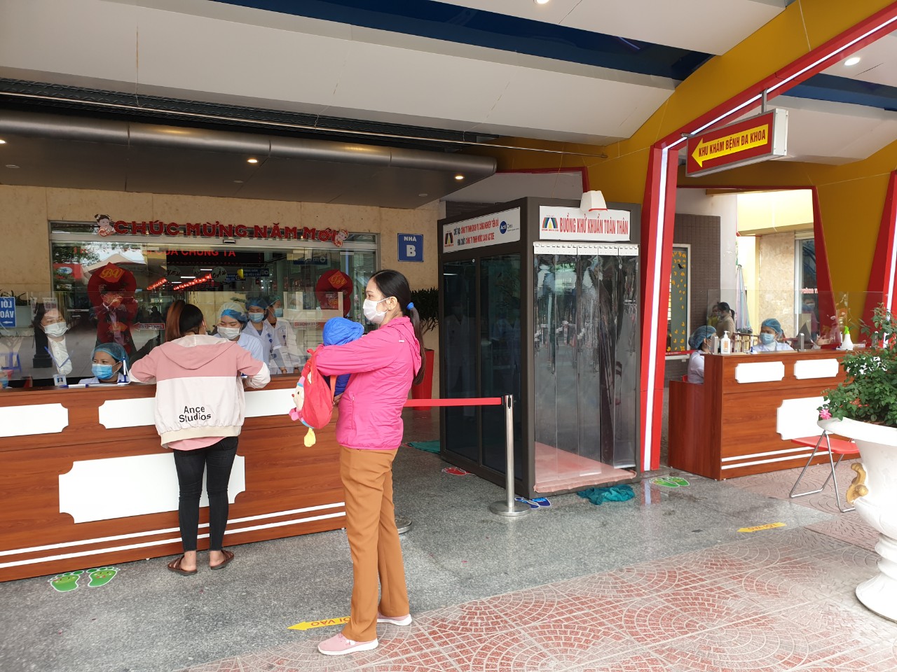 - Tại khu vực của phòng khám, nơi tiếp đón và kê khai tờ khai y tế của người bệnh và gia đình người bệnh. Bệnh viện bố trí 02 bàn hướng dẫn và kê khai y tế, khi kê khai y tế xong tất cả mọi người ra vào khu vực phòng khám đều bắt buộc phải đi qua buồng khử khuẩn.