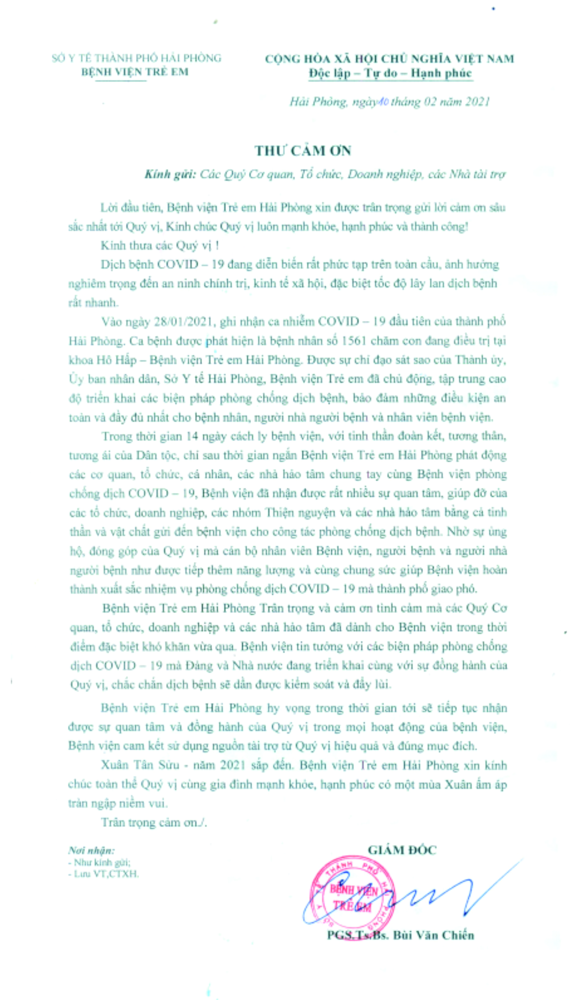 Bệnh viện Trẻ em Hải Phòng trân trọng và cảm ơn tình cảm mà các Quý cơ quan, tổ chức, doanh nghiệp và các nhà hảo tâm đã dành cho Bệnh viện trong thời điểm đặc biệt khó khăn vừa qua. Bệnh viện tin tưởng các biện pháp phòng chống dịch COVID-19 mà Đảng và Nhà nước đang triển khai cùng với sự đồng hành của Quý vị, chắc chắn dịch bệnh sẽ dần được kiểm soát và đẩy lùi.