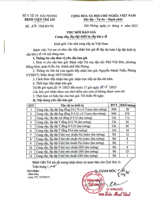 Danh mục giá Dịch vụ kỹ thuật áp dụng tại Bệnh viên Trẻ em